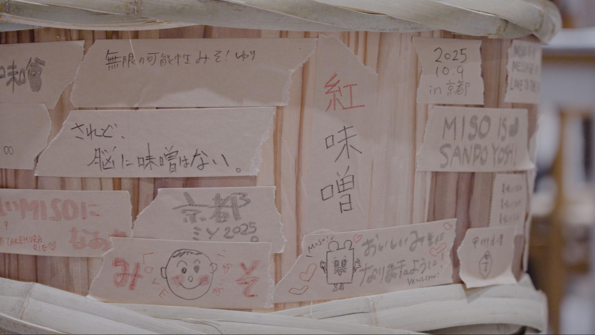 できあがった味噌には、未来へのメッセージを。「都市と循環」で味噌づくりワークショップを行った際には、参加者の方たちに、メッセージを樽に書いていただいた。